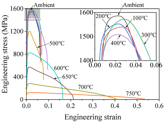 The typical engineering stress–strain curves of the SHTB at various temperatures are summarized in Figure 7. The stress–strain curves exhibited significant elastic and plastic behaviors, and no yield plateau was observed. Furthermore, the coupons were exposed to a temperature equal to or below 400 °C, the shape of the engineering stress–strain curves of coupons were similar, and the engineering strain at fracture changed little. However, when the coupons underwent a temperature exceeding 500 °C, the ultimate stress mark decreased with the increasing temperature, while a reverse trend was observed on the engineering strain. In addition, the yield stress (0.2% proof stress), ultimate stress, and the corresponding strain (ultimate strain) were also obtained from these engineering strain–stress curves.