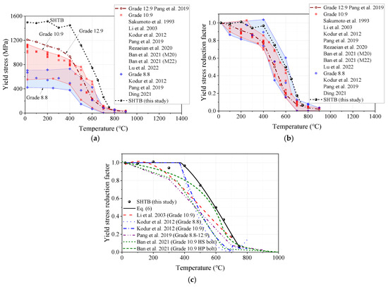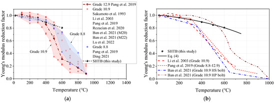 The deterioration of the mechanical properties of the SHTB under elevated temperature is represented by reduction factors. For the Young’s modulus, the reduction factor was defined as the ratio of the Young’s modulus from a specific temperature () to that of the coupons at ambient temperature (). Figure 8a presents the Young’s modulus reduction factor of SHTB in this test, along with that of conventional high-strength bolts (Grades 8.8, 10.9, and 12.9) in the previous literature [2,37,39,44,45,48,49]. It can be found that the Young’s modulus reduction factor of the SHTB decreased with increasing temperature; a similar trend can also be found in the public data. However, when the temperature exceeded 400 °C, the Young’s modulus reduction factor of SHTB was larger than that of the conventional high-strength bolts. Figure 8b illustrates the comparisons of the Young’s modulus reduction factor of the SHTB with the predicted formulae suggested by previous studies. It was found that these existing formulae could not well predict the Young’s modulus reduction factor of the SHTB because these formulae were proposed based on the test data of conventional high-strength bolts. According to Wang et al. [25], an exponent formula was proposed to predict the Young’s modulus reduction factor of the SHTB, as shown in Equation (4). As shown in Figure 8b, the proposed formula could well predict the test data in this study.