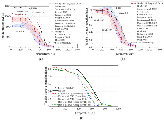 The ultimate stress reduction factor was defined as the ratio of the ultimate stress under a specific temperature level () to that of the coupons at ambient temperature (). Figure 11 presents the comparisons of the ultimate stress, ultimate stress reduction factor, and prediction formulae from this study and other public studies. Similar to the comparisons of the yield stress, the SHTB also exhibited a much larger ultimate stress than that of the conventional high-strength bolts under the same temperature, as shown in Figure 11a. This means that the SHTB can provide a larger capacity than the high-strength bolts when affected by the same fire hazard. Figure 11b presents the ultimate stress reduction factor of the SHTB in this study and that of the conventional high-strength bolts in previous studies [2,3,37,39,44,45,48,49]. It was found that the ultimate stress reduction factor of the SHTB was also much larger than that of the Grade 12.9 high-strength bolt when the temperature exceeded 200 °C, which indicates a marked difference from that of the Grades 8.8 and 10.9 high-strength bolts. In addition, the authors also compared the prediction formulae of the yield stress reduction factor from previous studies, as shown in Figure 11c. It was found that Equation (6) could also well predict the ultimate stress reduction factor of the SHTB.