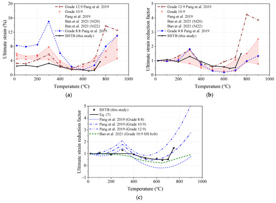 The ultimate strain reduction factor was defined as the ratio of the ultimate strain under a specific temperature level () to that of the coupons at ambient temperature (). Figure 12 presents the comparisons of the ultimate strain, ultimate strain reduction factor, and prediction formulae from this study and other public studies. As shown in Figure 12a, it was found that the ultimate strain of the SHTB was much smaller than that of the high-strength bolts with the same temperature. However, with the increase in temperature, the ultimate strain of the SHTB was steadier than that of the high-strength bolts (exhibited a smaller change). Given the smaller ultimate strain, the ultimate strain reduction factor of the SHTB ranged from the lower and upper results of the data for high-strength bolts, as shown in Figure 12b. As shown in Figure 12c, the existing formulae in previous studies could not well predict the ultimate strain reduction factor of the SHTB. Thus, the use of Equation (7) as the prediction formula for the ultimate strain reduction factor of the SHTB was recommended. This formula is in good agreement with the experimental data.