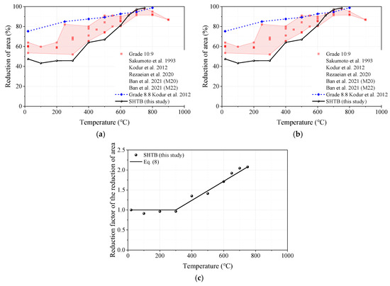 The reduction factor of reduction in cross-section area (reduction factor of reduction in area) is defined as the ratio of the reduction in cross-section area (reduction in area) under a specific temperature level () to that of the coupons at ambient temperature (). As shown in Figure 13a, the reduction in area of the SHTB exhibited an increasing trend with the increasing temperature and was much smaller than that of the high-strength bolts when the temperature exceeded 600 °C, but the opposite was true when the temperature exceeded 600 °C. Because of this reason, the reduction factor of the reduction area of the SHTB was much higher than that of the high-strength bolts when the temperature was higher than 600 °C, as shown in Figure 13b. Therefore, Equation (8) is recommended as the prediction formula for the reduction factor of the percentage reduction in area of the SHTB. This formula is in good agreement with the experimental data.