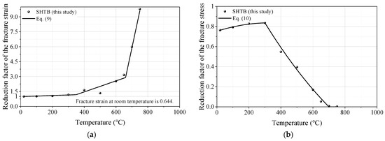Figure 14 presents the reduction factors of the failure strain and stress of the SHTB. The reduction factor of failure strain was defined as the ratio of the failure strain under a specific temperature level () to that of the coupons at ambient temperature (), while the reduction factor of failure stress was defined as the ratio of the failure stress under a specific temperature level () to the yield stress under ambient temperature ().