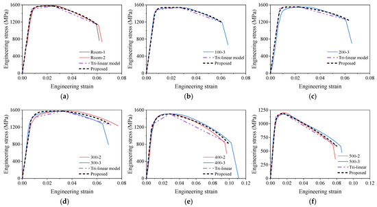 Figure 15 presents the comparisons of the stress–strain curves of the SHTB from the tests, the tri-linear model, and the proposed model. It was found that both the trilinear model and the proposed model described the characteristics of stress–strain curves of the SHTB under various temperatures. However, the curves from the proposed model agreed more with the test data and also showed a difference of proportional limit and proved yield stress at 0.2% plastic strain. Therefore, the proposed model is recommended for component models for structural steel joints, and the trilinear model is more recommended for simplified analysis.