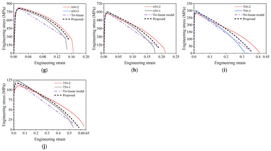 Comparisons of the stress–strain curves from test and proposed model: (a) room temperature; (b) 100 °C; (c) 200 °C; (d) 300 °C; (e) 400 °C; (f) 500 °C; (g) 600 °C; (h) 650 °C; (i) 700 °C; (j) 750 °C.