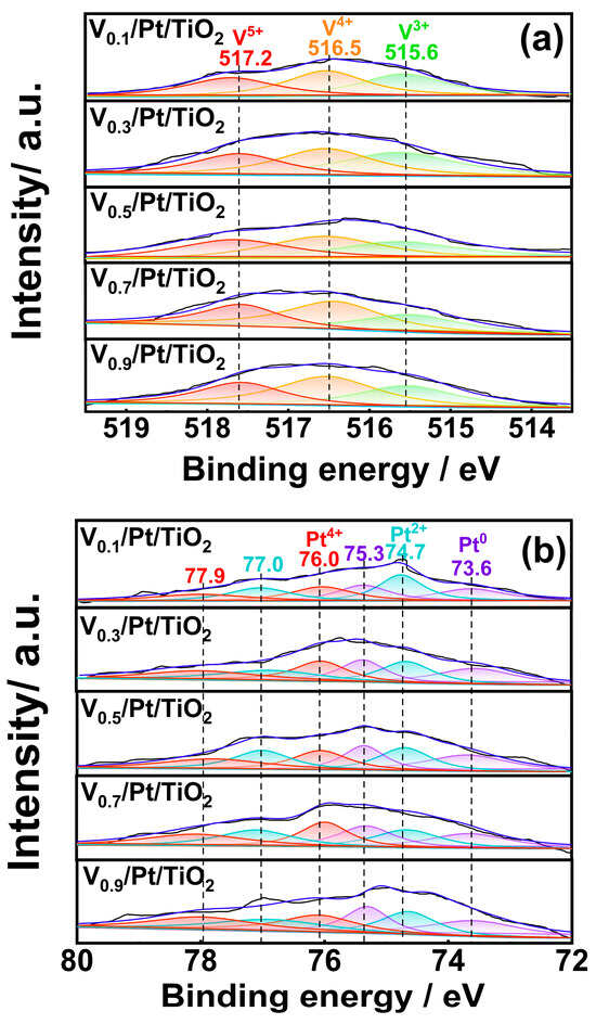 The Pt 4f spectra of the Vx/Pt/TiO2 catalyst are presented in Figure 6b. It can be seen that each of spectra could be resolved into four sub-peaks. As marked in Figure 6b, sub-peaks in the range of 73.6 to 77.9 eV could be ascribed to Pt0, Pt²⁺, and Pt⁴⁺ species [27,28]. As shown in Table S3, when the V loading amount was increased from 0.1 wt.% to 0.5 wt.%, the Pt0/(Pt0+Pt2++Pt4+) ratio of the Vx/Pt/TiO2 catalyst increased from 35.56% to 37.66%. When the V loading amount was further increased from 0.5 wt.% to 0.9 wt.%, the Pt0/(Pt0+Pt2++Pt4+) ratio of the Vx/Pt/TiO2 catalyst decreased from 37.66% to 35.23%. This suggested that adopting a V loading amount of 0.5 wt.% was conducive to the generation of the Pt0 species. Compared to the Pt2+ and Pt4+ species, the Pt0 species possess much higher catalytic oxidation activity, which is mainly attributed to its high activity in O2 dissociation [22,23]. Therefore, the existence of a relatively larger amount of Pt0 species was beneficial for the V0.5/Pt/TiO2 catalyst to oxidize more NH3 into NOx, providing more reactants for the NH3-SCR reaction, thus promoting the generation of N2.