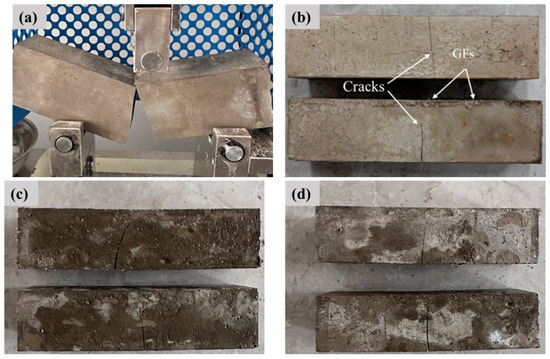 The GFs content affects the fracture morphology of composites, as shown in Figure 6. The press stops immediately when the testing machine detects a sudden drop in load from the peak value. At this stage, typical brittle damage under bending loading is found in the Ref. specimen. The crack expanded rapidly and fractured into two parts after the Ref. specimen was subjected to loads. However, the composites containing GFs cracked and did not fracture completely after being loaded. This indicates that the specimen avoids direct fracture under loads due to the network toughness of GFs.