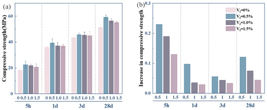 Compressive strength of composites: (a) compressive strength; (b) increase rate of compressive strength.