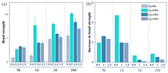 Bond strength between composites and OPCM: (a) bond strength; (b) increase rate of bond strength.