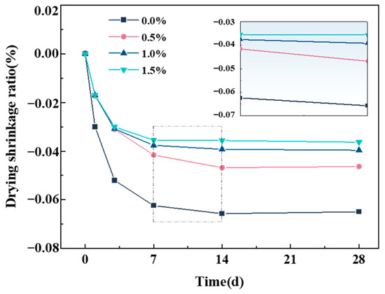 The dry shrinkage property of composites (with dimensions of 25 mm × 25 mm × 280 mm) was assessed following the Chinese standard repairing mortar (JC/T 2381-2016) [24]. The initial shrinkage value was recorded after adding water for 3 h and demolding. Subsequently, the samples were placed in standard test conditions until specific ages (1 d, 3 d, 7 d, 14 d, and 28 d) were reached. The test result was determined as the average shrinkage value of the three groups of samples at specific ages.
