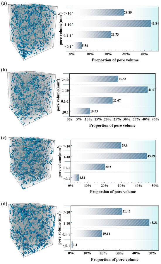 Proportion of pore volume of composites at 28 d: (a) Ref.; (b) GFs-0.5; (c) GFs-1.0; (d) GFs-1.5.