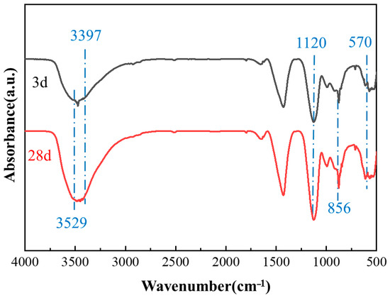 The FTIR spectra of the composites for different curing times are shown in Figure 13. The absorption peak at 570 cm−1 corresponds to the [Al] octahedral structural absorption peak of the AH3, while the absorption peak at 856 cm−1 exhibits an asymmetric telescoping vibration of AlO45− in the SAC. In addition, the absorption peak at 3400 cm−1 is attributed to the O-H bond stretching vibration of the C-S-H gel water of crystallization. In particular, the peak at 3400 cm−1 at 28 d was smaller than at 3 d, indicating the slower hydration of OPC cement than SAC. The FTIR spectra of cement hydration at 28 d show a stronger peak centered at 1120 cm−1, attributed to the high frequency of asymmetric telescopic vibrations of columellate. Additionally, the width of the gypsum band in the range of 3397–3529 cm−1 for 28 d of hydration was observed to be weaker in comparison to the 3 d hydration period, thereby suggesting that C4A3 hydrated with CH and gypsum.
