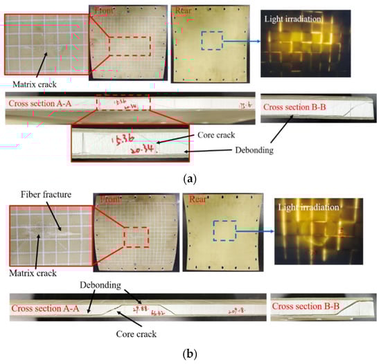 Visual inspection of impact and rear surface damage is the most straightforward method, primarily focusing on identifying morphological changes. Given the good light transmittance of the GFRP face sheets, a strong light was used to irradiate the impact surface of the specimen with no rubber layer, enabling the observation of the damage characteristics and area from the back side (Figure 4).