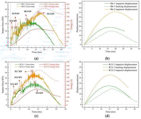 No damage occurred in R12-1-R and R6-1-R. In the ideal case, the impact force–displacement curve in that region should be 0. Nevertheless, in Figure 13c, energy absorption can be observed, which can be attributed to one of the following three reasons: first, the displacement values on the horizontal axis are derived from the integral of the impact force curve, which may contain high-frequency noise and other errors; second, the bolts used to fix the boundary may have caused energy dissipation; third, the sandwich structure may have undergone slight plastic deformation, absorbing part of the energy. In Figure 13c,d, it can be observed that the initial stiffness of the system composed of the curved plate and the rubber layer was dominated by the rubber, which had a significantly lower modulus; therefore, at this point, the curve was smooth. When the impact force increased, after the rubber reached its energy absorption threshold, the stiffness of the sandwich plate became the dominant factor. At this point, the effect of curvature was reflected in the curve, and a burr signal appeared in the curve. Hence, in Figure 13d, R6-2-R experienced the initial damage, and the impactor reached the maximum displacement due to severe stiffness degradation. On the contrary, in Figure 13c, the impact–displacement curves nearly overlapped since no damage occurred, with only minor differences in the main region of action of the plate.