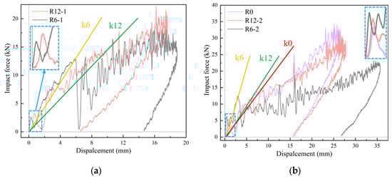 Figure 13 depicts the impact force–displacement curves at different impact velocities, reflecting the stiffness change and energy absorption characteristics of the BMC-SCS. According to Figure 13a,b, the initial load was reduced to 0 after 2.5 kN, indicating that the 1.5 mm thick GFRP plate was damaged. However, the local face sheet damage had little effect on the overall stiffness of the structure. The core crack is defined as the initial damage that has a significant impact on the overall stiffness and damage evolution. The initial stiffness is the stiffness before the occurrence of the initial damage, which followed the order R6-1 > R12-1 and R6-2 > R12-2 > R0 and was clearly affected by the curvature. The initial damage occurred earlier in R6, with a smaller initial damage displacement and less energy absorbed at this stage. After the occurrence of local damage and stiffness degradation, the damage expanded outward, forming a wider overall damage area; thus, the impact displacement in R6 was the largest, and the damage was more severe.