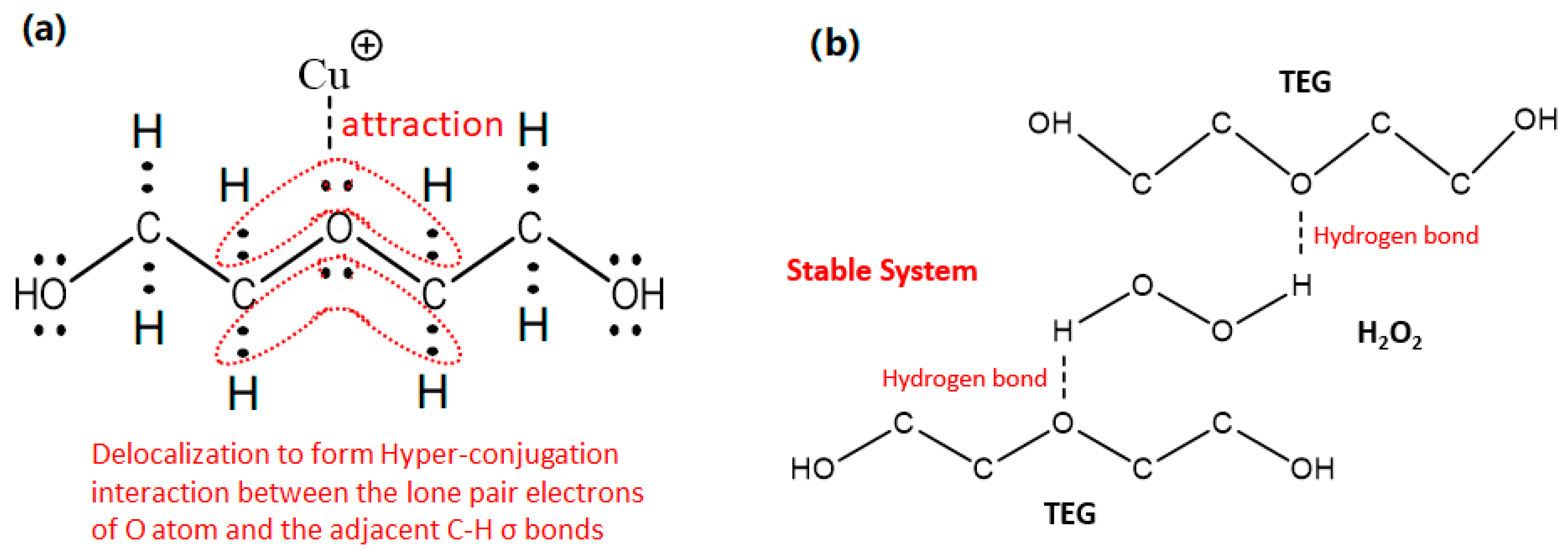Theoretical explanation for the stabilization of H2O2 by alcohol ether compounds: (a) complexation between TEG and Cu2+; (b) the stabilizing effect of hydrogen bonds between TEG and H2O2.