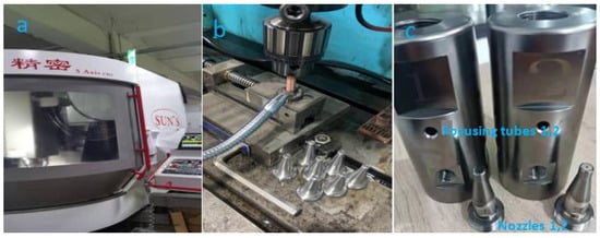 Fabrication process for nozzles and focusing tube. (a) Machining nozzle and focus tube on CNC SUN’5 Axis lathe, (b) clamp of nozzle cavity, (c) experimental sample of nozzle and focusing tube.