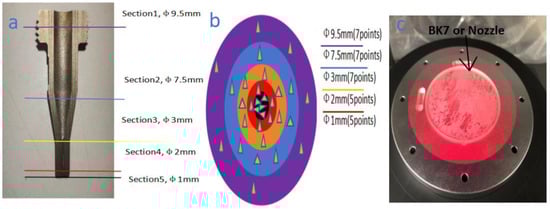 The experiment verifies the corrosion resistance of the two nozzles on the ultra-precision polishing platform. The schematic diagram of the precision platform is shown in Figure 1. Before performing the experiment, the surface accuracy of all nozzles and focusing tubes are guaranteed almost as well. The RMS of the nozzles and focusing tube are detected by the ZYGO in Figure 7a and flash tester in Figure 7b,c.