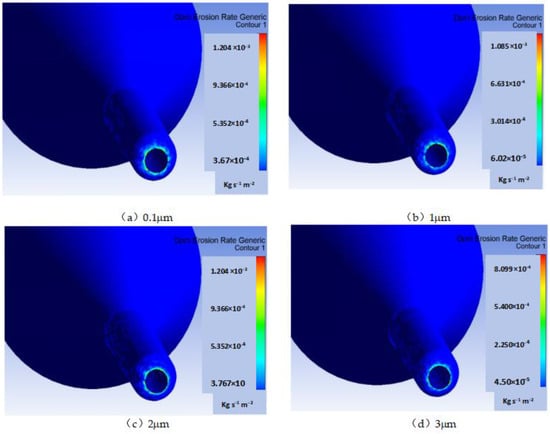 In ultra-precision polishing, the wear degree of the nozzle outlet seriously affects the surface accuracy of polishing BK7. In order to ensure the corrosion resistance and wear resistance of the nozzle in the injection system, increasing the hardness of the nozzle and improving the accuracy of the workpiece become the priority. Although 304 stainless steel has the ability to wear and resist corrosion, the abrasive cerium oxide and alumina in the polishing jet are extremely corrosive. The 304 stainless steel will chemically react with the nozzle, resulting in corrosion and rust of the jet device in the jet system, especially the position of the nozzle outlet. Figure 5 shows the wear cloud diagram of nozzle cavity under four different abrasive diameters obtained by numerical simulation. The wear near the nozzle is mainly caused by the impact force of abrasive particles and chemical corrosion. As can be seen from the curve in Figure 6, the erosion rate of the particles in the nozzle cavity decreases with the increase in particle diameter in the range of 0.5 μm to 3 μm.