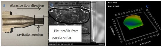 To maintain the RMS of BK7 at 30 nm, the working limit time of the coated nozzle was within 480 h. Therefore, wear analysis of nozzle during 60 days of operation should be performed on the ultra-precision platform. The wear condition of 304 stainless steel nozzle should be tested after the fatigue test. The surface accuracy of BK7 processed by the uncoated nozzle was measured continuously during the 480 h test and it was found that the limit processing time of BK7 maintaining a surface roughness of 30 nm was 280 h. Figure 9 shows the wear condition of the surface of the 304 stainless steel with the uncoated nozzle after the test. It is shown in Figure 9a that the nozzle cavity has severe cavitation erosion. Due to the fineness of the abrasives and their adhesion to each other, it is difficult for 304 stainless steel to isolate the polishing powder. Because of the lower pressure (2–3.5 MPa) and the larger abrasive liquid concentration, the nozzle cavity is blocked easily. Figure 9b shows material migration and build-up occurs from the nozzle outlet of 304 stainless steel. It is also shown in Figure 9b that deformation of 304 stainless steel occurs in uncoated nozzles, and the 304 stainless steel does not have sufficient hardness to resist the abrasive flow impact. Figure 9c is the graphic of the laser interferometer measurement (ZYGO, USA) of the wear at the nozzle outlet position, belonging to detection of the boxed area shown in Figure 9b.