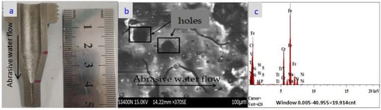 SEM images of nozzle 1 without coating after 480 h tests. (a) Experimental nozzle profile; (b) the wear area at the nozzle 1 exit position magnification, magnification 300×; (c) the main metal contents of the nozzle 1 outlet wear area.