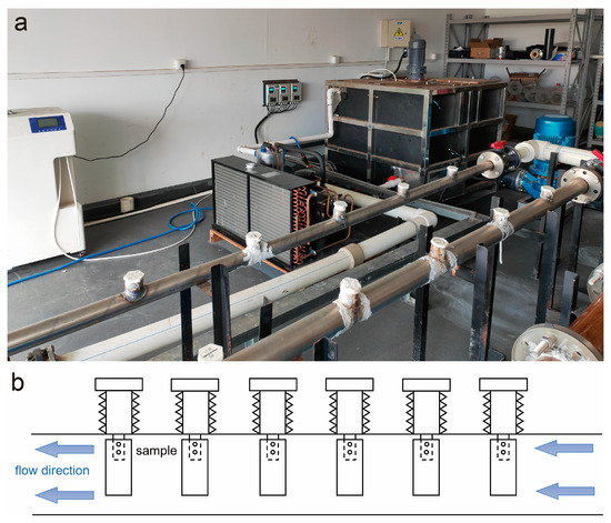 The erosion–corrosion test device: (a) the device in the laboratory; (b) the device schematic.