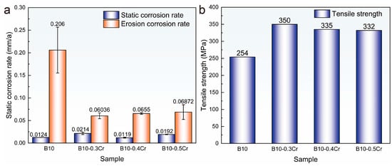 Figure 2a shows a comparison of the corrosion rates of the four alloys. Although the static corrosion rate of the B10-xCr alloy is marginally higher than that of the B10 alloy, its erosion–corrosion resistance improves significantly, with the corrosion rate reduced by approximately 70%, showcasing its superior performance. Figure 2b compares the tensile strength of the four alloys, showing that the addition of Cr increases the strength of the B10-Cr alloy by approximately 30%. This enhancement improves impact resistance and further strengthens its erosion–corrosion performance. Among the three newly prepared alloys, the B10-0.3Cr alloy exhibits the highest corrosion resistance. Therefore, the subsequent characterization and discussion are based on the B10-0.3Cr alloy, abbreviated as (B10-Cr).