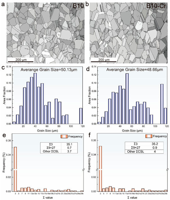 IPF images and grain size statistics of B10 and B10-Cr alloys: (a) IPF image of B10; (b) IPF image of B10-Cr; (c) grain size statistics of B10; (d) grain size statistics of B10-Cr (e) special boundary frequency of B10; (f) special boundary frequency of B10-Cr.