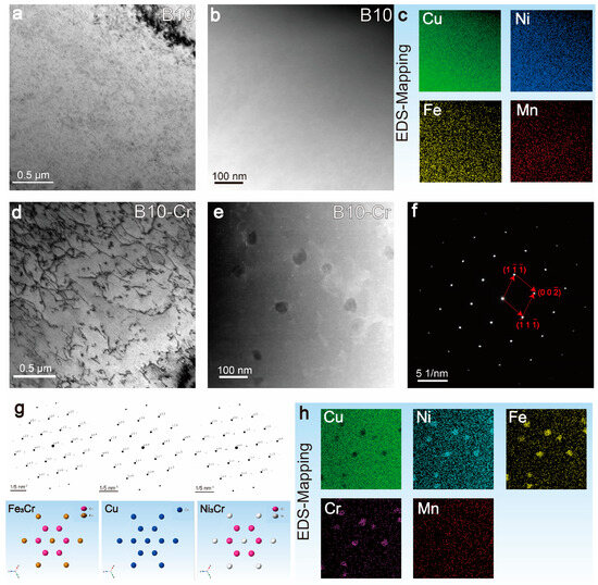 TEM images of B10 and B10-Cr alloy: (a) bright field of B10 alloy; (b) HAADF-STEM images of B10-Cr alloy; (c) EDS mapping of this area; (d) bright field of B10-Cr alloy; (e) HAADF-STEM images of B10-Cr alloy; (f) SAED of the phase; (g) simulated diffraction spots of (Fe/Ni)3Cr and Cu on [110] direction; (h) EDS mapping of this area.