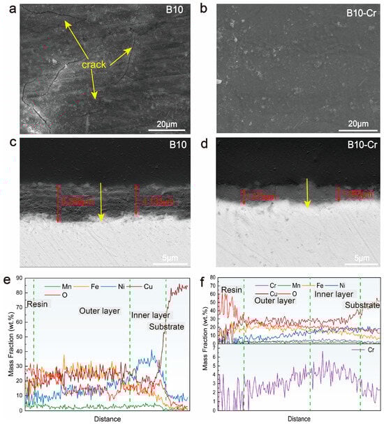 Microstructure of corrosion product film: surface of the corrosion product film: (a) B10; (b) B10-Cr; cross-sections of the corrosion product film: (c) B10; (d) B10-Cr; line scan results: (e) B10; (f) B10-Cr.