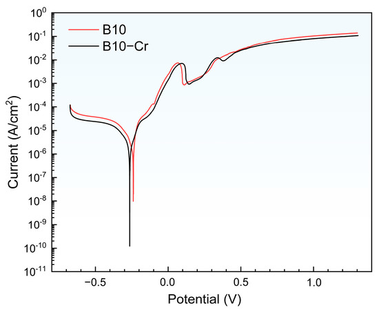 Figure 6 shows the polarization curves for two alloys with polished surface. In the figure, it can be seen that the corrosion potential of the B10-Cr alloy (approximately −0.26 mV) is lower than that of the B10 alloy (approximately −0.23 mV). At any given potential, the passive current density of the B10-Cr alloy is slightly lower than that of the B10 alloy. The results suggest that the B10-Cr alloy is more easily passivated than the B10 alloy, indicating that the B10-Cr alloy has better corrosion resistance. This may be because Cr is more easily passivated than Cu. The Nernst equation is as follows: