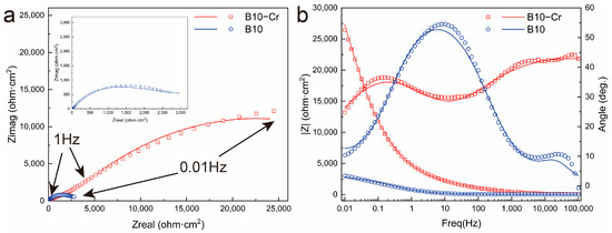 The EIS results: (a) Nyquist plots of B10 and B10-Cr alloy; (b) bode plots of the two alloys.