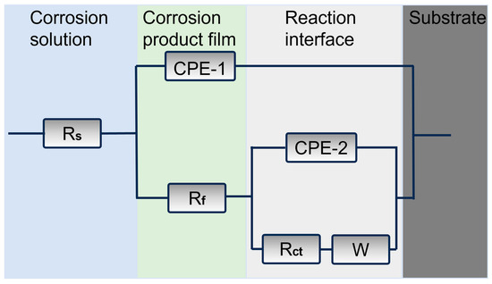 In the Bode plot, there are two peaks in the phase angle as a function of frequency, which indicates that the fitting circuit should have two time constants. Since the corrosion product film has a bilayer structure, the circuit shown in Figure 8 is used for fitting, where Rs represents the solution resistance, while CPE-1and Rf are in parallel, CPE-1 describes the capacitance of the corrosion product film, and Rf describes the resistance of corrosion product film. CPE-2 describes the double layer capacitance, and Rct describes the charge transfer resistance. The symbol W denotes the Warburg impedance, indicating the diffusion process. Considering the roughness of the surface of the corrosion product, the constant phase element (CPE) is used instead of the ideal capacitive element.