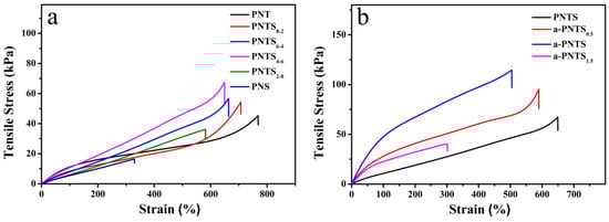 Tensile stress–strain curves of PNTS hydrogels with different (a) THMA/SBMA ratios and (b) ANF contents.