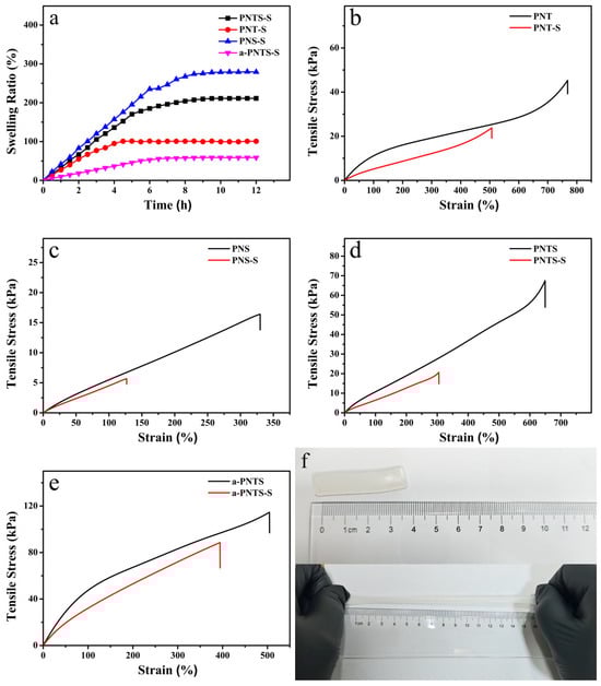 (a) Swelling ratios of PNS, PNT, PNTS and a-PNTS hydrogels. Tensile stress–strain curves of hydrogels before and after swelling: (b) PNT, (c) PNS, (d) PNTS and (e) a-PNTS. (f) Comparison photographs of a-PNTS-S hydrogels before and after stretching.