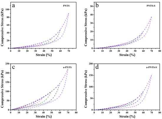 Compressive stress–strain curves of hydrogels: (a) PNTS, (b) PNTS-S, (c) a-PNTS and (d) a-PNTS-S.