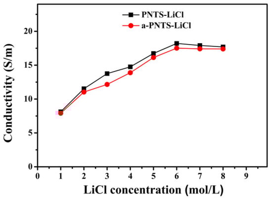 The PNTS and a-PNTS hydrogels were soaked in lithium chloride solutions with different concentrations for 24 h, and then their ionic conductivities were measured (Figure 7). The ionic conductivity of the PNTS and a-PNTS hydrogels increased with the increase in the LiCl solution concentration, and reached the maximum when the LiCl concentration was 6 mol L−1, which indicates that the combination of sulfonic groups, amino groups, carbonyl groups and hydroxyl groups of the hydrogel with Li+ and the combination of −N+(CH)2 and Cl−1 produced saturation. At this time, the ionic conductivities of the PNTS and a-PNTS were 18.2 S m−1 and 17.5 S m−1, respectively. It was found that the ionic conductivity of the a-PNTS hydrogel was slightly lower than that of the PNTS hydrogel, which indicates that the introduction of ANFs built more strong hydrogen bonds inside the hydrogel and reduced the combination between some functional groups and LiCl.