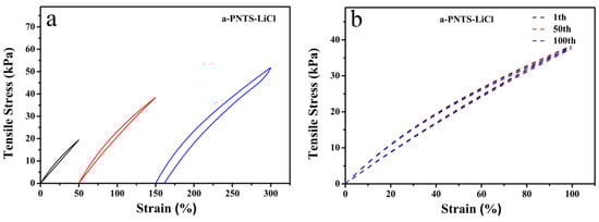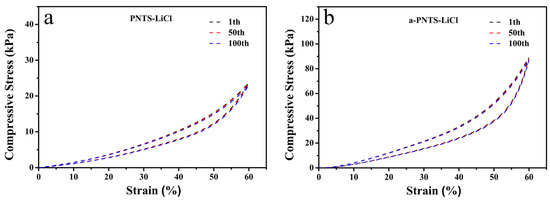 The PNTS and a-PNTS hydrogels soaked in 6 M LiCl were named PNTS-LiCl and a-PNTS-LiCl, respectively, and their compression recovery stabilities under 60% compression strain were tested (Figure 8). It was found that after 100 cycles of compression, the compression strengths of the PNTS-LiCl and a-PNTS-LiCl hydrogels were almost undamaged, which means that they have the potential to be used as pressure sensors.