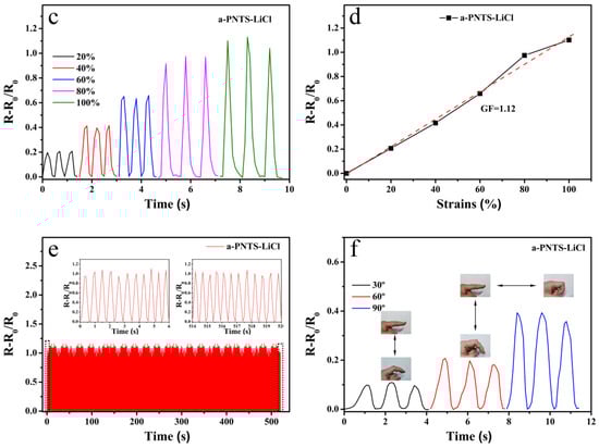 Due to the excellent tensile properties of the a-PNTS-LiCl, we found that its tensile strength could be restored to 100% tensile strain and remained stable after 100 tensile cycles (Figure 10a,b). This means that it can also serve as a stretch sensor. The current responses of the a-PNTS under different tensile strains were tested. As shown in Figure 10, the a-PNTS-LiCl sensor exhibited regular current changes under different tensile strains, with a gauge factor (GF) of 1.12. At the same time, it was fixed at the finger joint to identify whether it could detect human movement. It can be observed that the current response increased regularly as the finger joint bent back and forth at angles of 30°, 60° and 90°. This indicates that it has great potential for application in wearable devices for detecting human motion.