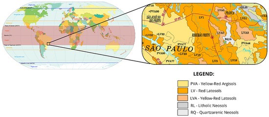 World map indicating tropical and subtropical regions, highlighting the Ribeirão Preto-SP region and the distribution of predominant soils in the area. Adapted from KVDP (2013) [42] and Embrapa (2001) [43].