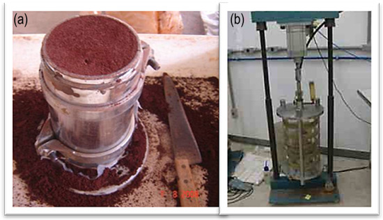 The mechanical analysis included tests to determine key soil properties, such as the resilient modulus and permanent deformation. To simulate the material’s behavior under traffic conditions, repeated load triaxial (RLT) tests were performed in accordance with DNIT 179 [52] and DNIT 134 [53]. These standards establish procedures for evaluating the mechanical properties of soils, which are essential for predicting the performance of pavement materials. Figure 3 illustrates the molded Purple Clay specimen, while Figure 3b shows the specimen inside the triaxial apparatus.
