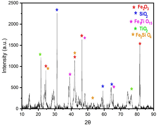 XRD analysis of the studied sample (Figure 6) identified the presence of iron oxides (Fe2O3), quartz (SiO2), iron titanates (FeTiO15), titanium dioxide (TiO2), and iron silicates (Fe2SiO4). These results align with previous studies on lateritic materials, indicating a matrix rich in metal oxides and silicates. Additionally, the mineral phases kaolinite, quartz, hematite, and goethite were identified, which are commonly found in lateritic soils [63]. Kaolinite, known for its non-expansive nature in the presence of water, enhances the material’s stability under humid conditions, in contrast to expansive clays that undergo significant volumetric changes, as discussed by Barbosa [64]. Similarly, Kamtchueng et al. [20], Santha Kumar et al. [65], and Santana et al. [66] also reported high levels of iron oxides and quartz in comparable samples, reinforcing the role of weathering in shaping the mineralogical composition.
