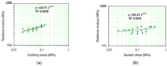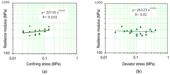 The analysis of Figure 7a demonstrates that confining stress has a considerable influence on the material’s behavior, potentially increasing RM by up to 100% when varying from the minimum to the maximum values adopted in the tests [70]. A similar trend was observed by Samb et al. [71], who reported that the resilient modulus decreases with increasing deviatoric stress under constant confining pressure but increases when cement is added at similar moisture contents. These findings align with the results shown in Figure 7a, where confining stress significantly affects RM values, while deviatoric stress has little influence. This is further evidenced in Figure 7b, where the correlation coefficient obtained was extremely low.