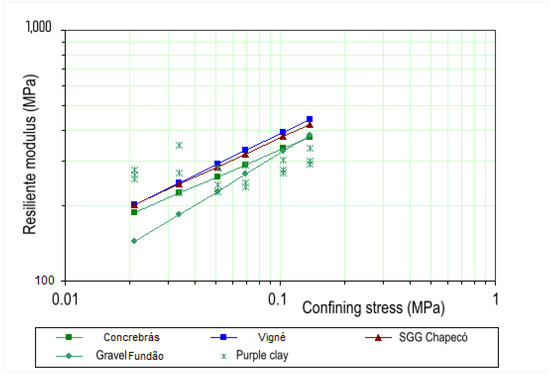 The comparison of the RM values of Purple Clay with those of different types of graded crushed stone is presented in Figure 10. The data for Concrebrás and Vigné aggregates were obtained from Ramos and Motta [75], while the values for the graded crushed stone from Chapecó were sourced from Guimarães and Motta [76]. Additionally, the values for the Fundão aggregate come from recent studies conducted at the geotechnical laboratory of COPPE/UFRJ [21]. It is important to note that all graded crushed stones were compacted using energy equivalent to the modified Proctor test.