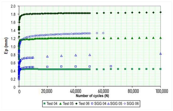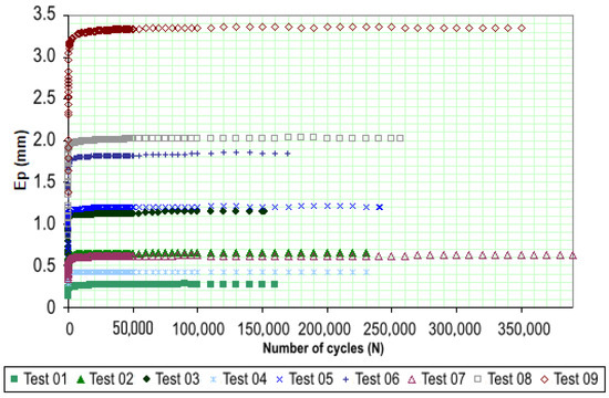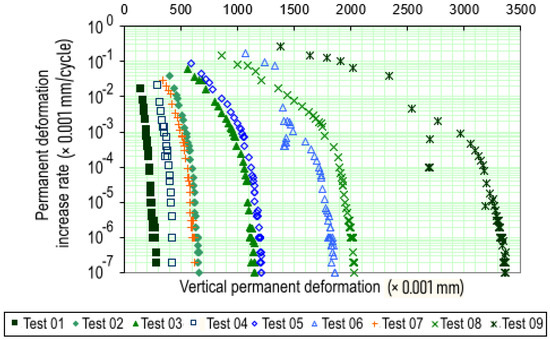 In Figure 11, the results of the permanent deformation (PD) tests listed in Table 1 are presented, showing the total or accumulated PD of the 20 cm-high specimens as a function of the number N of load applications. Each test number in the figure corresponds to the conditions specified in Table 1, which include different stress levels () and the stress ratio (). For example, tests 1, 2, and 3 were conducted with stress levels of 40 kPa, 80 kPa, and 120 kPa, respectively, and with a constant stress ratio of () equal to 1. Similarly, tests 4, 5, and 6 were performed at higher stress levels, with each test identified by a specific combination of these parameters.