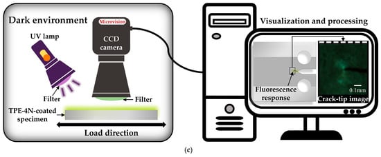 The preparation of the CT specimen coated with TPE-4N sensing film is illustrated in Figure 1b. A TPE-4N/chloroform solution was prepared at a concentration of 0.02 g/mL and coated on the surface of the specimen using a drop-coating process. At this time, an amorphous TPE-4N film was formed on the surfaces of the specimen, emitting green fluorescence under UV light. Subsequently, the specimen was heated to 150 °C for 15 min, resulting in the transformation of the TPE-4N film into a crystalline state, accompanied by quenching of the green fluorescence. After that, the specimen was deformed under uniaxial loading; then, the fluorescence appeared near the crack tip.