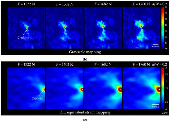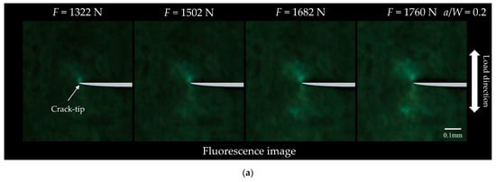 Figure 2a illustrates the typical mechanoresponsive fluorescence responses near the crack tip of the CT specimen with a/W = 0.2 under the vertical uniaxial tensile loading (width 100 × height 110 pixels). It is seen that the visible green fluorescence emits near the crack tip, indicating that the local deformation near the crack tip is converted into the visible mechanoresponsive fluorescence of TPE-4N film. To eliminate the uncertainty in the overall brightness of the fluorescence images caused by environmental factors or the experimental setup, the images presented in Figure 2a were normalized by subtracting the corresponding background brightness from the grayscale images of fluorescence images. For enhanced visualization, the grayscale images are represented as pseudo-color mappings in Figure 2b. Figure 2c presents the equivalent strain distribution near the crack tip obtained using the DIC method under the same condition. It is interesting to note that the fluorescence distribution obtained using the proposed MRL method agrees well with the equivalent strain distribution measured using the conventional DIC method. It is explained that the local strain near the crack tip of the substrate generates the change of crystalline structure of the surface TPE-4N film, resulting in fluorescence emission [30]. Therefore, the visible fluorescence response is utilized to estimate the maximum equivalent strain at the crack tip and the plastic zone size.