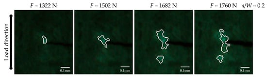 Representative results of segmenting fluorescent area of the CT specimen crack tip (ROI) under different tensile loads.