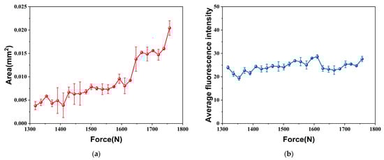 As indicated in Figure 4, the ROI increases gradually with the increasing tensile load. Therefore, both the area and average fluorescence intensity of the ROI can be extracted as simple characteristic values, which visually represent the variation in the fluorescence response near the crack tip. As shown in Figure 5, the evolution tendencies of the simple characteristic values in response to the applied load are characterized by the arithmetic means of five independently replicated experiments. Overall, it is seen from Figure 5a that the increased applied load induces an increase in the ROI area, but the area exhibits some fluctuations with increasing applied load. By contrast, it is seen from Figure 5b that the change in the average fluorescence intensity in the ROI is not significant with the increasing applied load. This phenomenon can be attributed to the fact that the rate of increase in average fluorescence intensity within the ROI is considerably less pronounced than that in area.