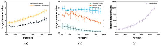 Figure 6 illustrates the variation in the arithmetic means of the first-order characteristic values with the increasing applied load derived from the five experiments. The average brightness and contrast of the fluorescence image texture consistently increase throughout the experimental process, which generates the increasing mean value and standard deviation. Interestingly, a phenomenon has been observed wherein the standard deviation exceeds the mean value. This occurrence can be attributed to the fact that the majority of pixels in the grayscale mappings of crack-tip fluorescence images are extremely dark, while a small subset of pixels exhibits extreme brightness. Consequently, the high-intensity pixels deviate from the mean to a significantly greater extent than the mean itself. The results of smoothness, uniformity, and entropy decreased during the experiment. The smoothness of significantly less than one indicates a considerable disparity in the grayscale values of the fluorescence image, attributable to background brightness elimination. The introduction of new grayscale levels further contributes to the ongoing decrease in smoothness and uniformity, ultimately leading to smoothness approaching zero. The reduction in entropy indicates a decrease in the amount of information present within fluorescence images. Moreover, the skewness remains consistently greater than zero and continues to grow, indicating that the grayscale histogram of the fluorescence image is skewed to the right, with the degree of skewness increasing rapidly. The underlying cause of this phenomenon is attributed to the increased intensity of the fluorescence response at the crack tip, which leads to the development of more new pixel points with high gray values, thereby rapidly extending the right tail of the grayscale histogram.