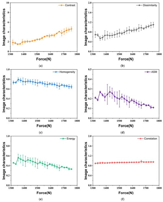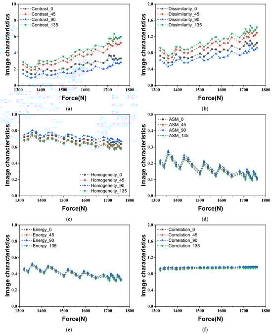 Evolution of second-order characteristic values averaged over four directions under uniaxial tension (a/W = 0.2): (a) Contrast; (b) Dissimilarity; (c) Homogeneity; (d) ASM; (e) Energy; (f) Correlation.